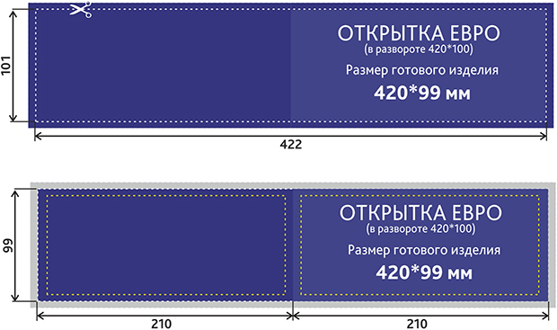 Размер открытки евро с припусками на обрез 422x101 мм (т.е. по 1 мм с каждого края);